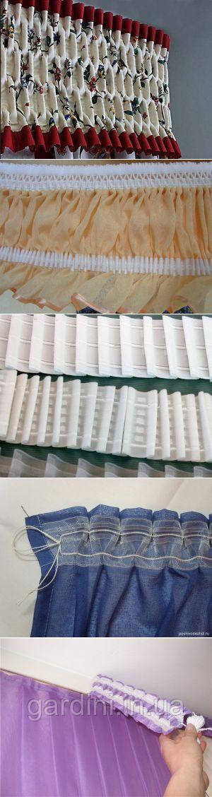 Мішечки. Після закінчення роботи шнури акуратно зв'язують вузликом між собою. Зайвий край тасьми обрізають і підвернув усередину, пристрочують. Шнури обрізати в жодному разі не можна, оскільки надалі для прання штору потрібно буде розпустити. Виходом із ситуації стане пошиття невеликого мішечка із залишків шторної стрічки, який акуратно пришивають на її край. У нього поміщають довгі шнури.